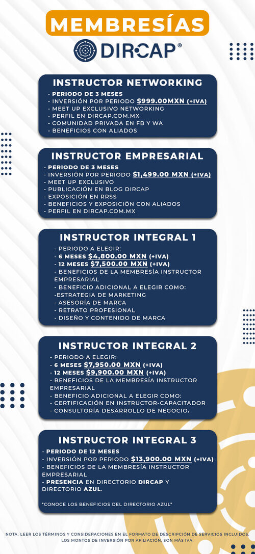 Es importante conocer, que previo a adquirir tu afiliación a DIRCAP, en la modalidad deseada, deberás cubrir ciertos requisitos, siendo uno de los principales : el contar con un mínimo de experiencia como facilitador/consultor de 2-3 años comprobables y que deberás hacer llegar a través de un link de pre-registro que te será compartido al ponerte en contacto a los correos: info@dircap.com.mx, atención@dircap.com.mx y/o directorio@dircap.com.mx...